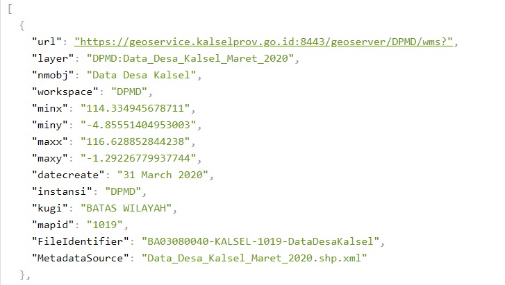 Dalam rangkan meningkatkan pemanfaatan data spasial dan untuk kemudahan akses maka sekretariat simpul jaringan daerah Provinsi Kalimantan Selatan menyiakan format API JSON agar data dapat di integrasikan kedalam berbagai aplikasi Sistem Infornasi Geografis.